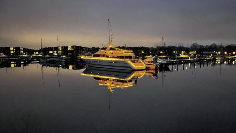 Lady Marjan ligger i Aalborg Marina på sin egen langskibsplads – med kongerigets måske smukkeste solnedgang. Pladsen i Aalborg kan følge med skibet, hvor der ifølge sælger er mulighed for at få folkeregisteradresse.