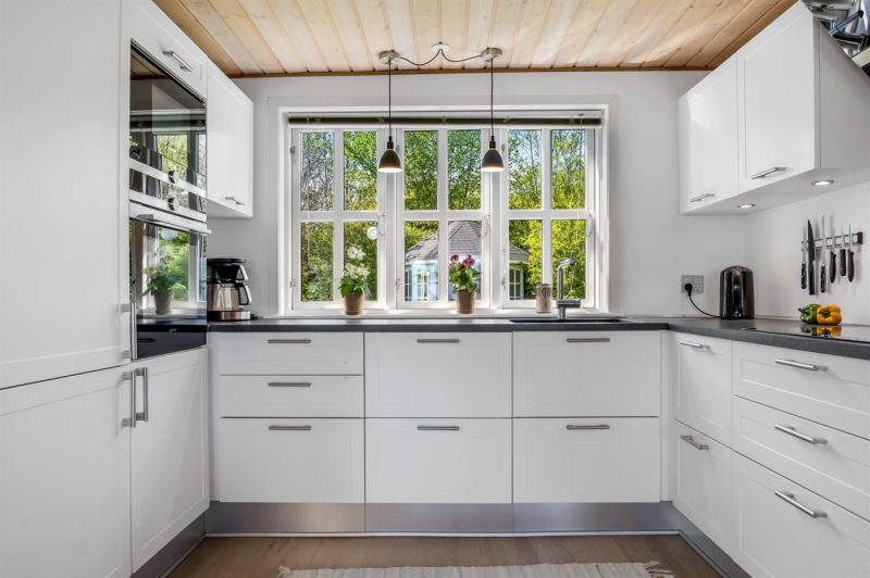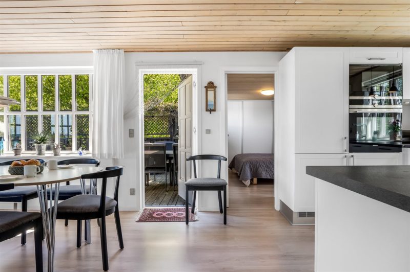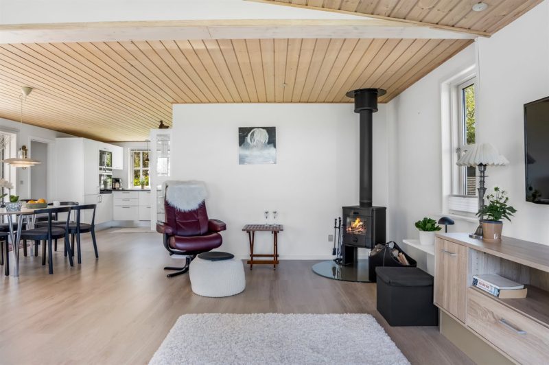 Boligen er løbende renoveret og udvidet og rummer sammen med det nyere anneks i alt 96 m². Planløsningen byder på entré med skabsplads, et lyst og indbydende opholdsrum med store vinduespartier og brændeovn samt varmepumpe. Køkkenet – et velholdt Svanekøkken – ligger i åben forbindelse med stuen og er udstyret med induktionskogeplader, varmluftovn, mikroovn, opvaskemaskine og køleskab. Fra opholdsrummet er der direkte udgang til den store træterrasse med markise.