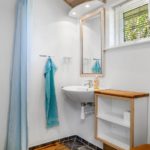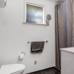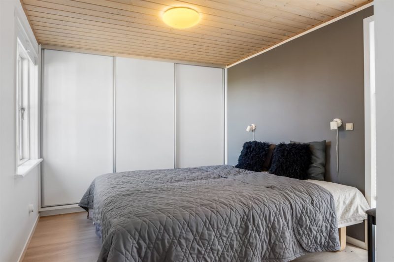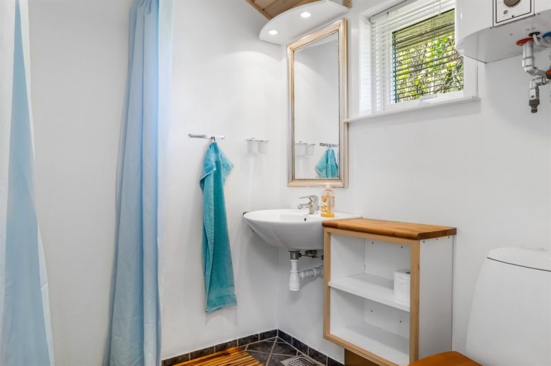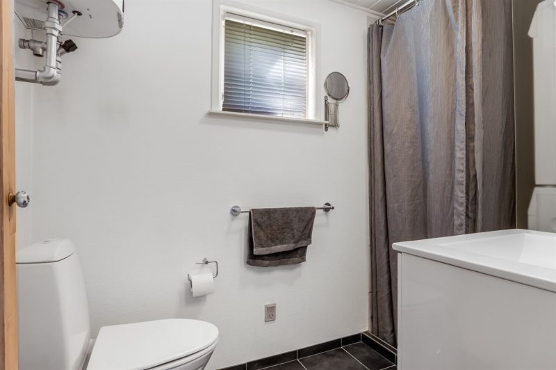 Hovedhuset rummer desuden et godt soveværelse med skabsvæg samt et pænt badeværelse med bruseniche, vaskefaciliteter og håndklædetørrer.