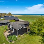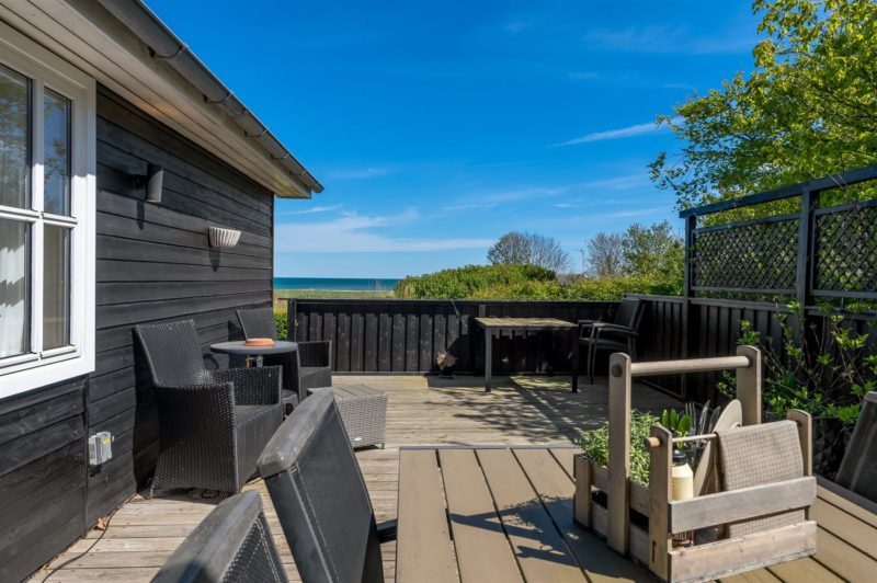 Sommerhuset fremstår i klassisk stil med sort træfacade og hvide sprossevinduer og byder på en flot og fri udsigt over havet samt kig til åbne marker og engarealer. Udsigten kan nydes både fra opholdsrummene og fra den store, østvendte træterrasse.