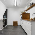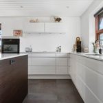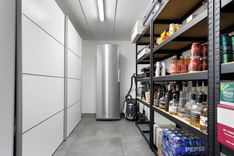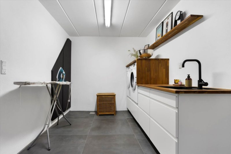 Kælderen rummer gangareal, praktisk bryggers med vaskefaciliteter, gæstetoilet, viktualierum samt et disponibelt rum. Den integrerede garage giver nem og tør adgang til boligen.