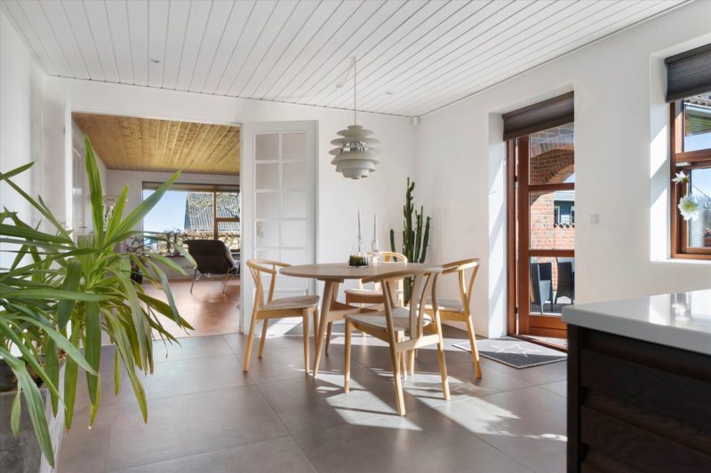 Opholdsrummet er lyst og indbydende med brændeovn og en skøn udsigt mod vandet. Det nyere JKE-køkken fremstår moderne og veludstyret med alle nødvendige hårde hvidevarer, god spiseplads og udgang til terrasse, hvor især eftermiddags- og aftensolen kan nydes.
